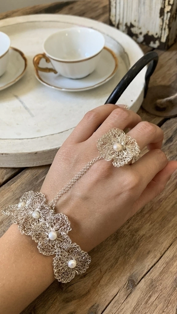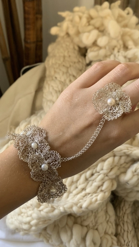 Material: Plata 1000 , tejido a mano al crochet bordado con perlas naturales